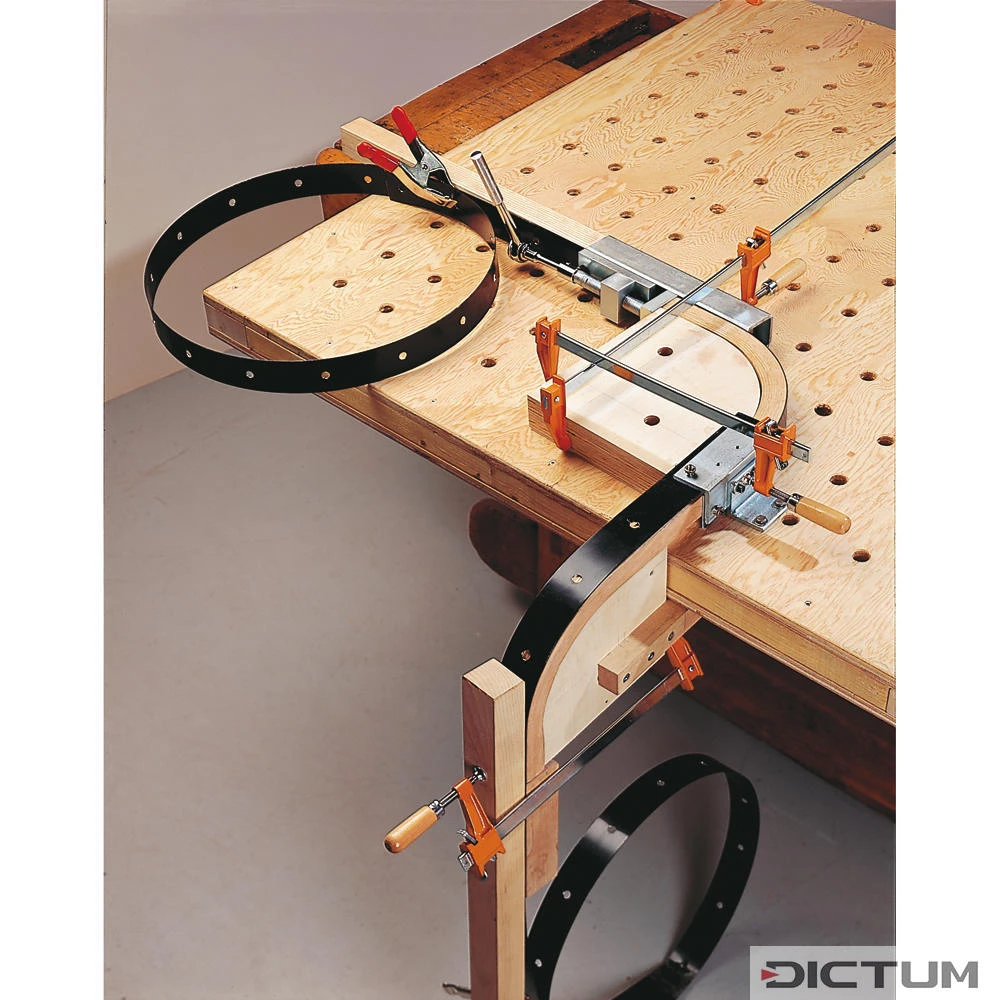 Pendant le cintrage à la vapeur, les fibres du bois à l’extérieur de la pièce à plier sont stabilisées par un feuillard, ce qui évite l’éclatement du bois. Pour limiter longitudinalement les pièces à plier en bois, il faut fixer aux trous existants du feuillard des dispositifs d’arrêts ou des éléments de serrage, par ex. 702307 ou 702308.