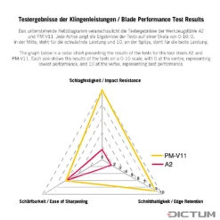 L’acier PM-V11 est réalisé à partir d’un nouveau type d’alliage d’acier métallurgique poudreux. Grâce à sa structure de matériau extra-fine et régulière ainsi que sa dureté élevée (HRC 61-63), cet acier atteint par comparaison une durabilité double de celle de l’acier A2. Ces fers très résistants permettent des tranchants tels les rasoirs et sont très résistants à l’usure, même avec un angle de biseau inférieur à 20°. Tous les fers sont livrés avec un micro-chanfrein de 2°. Affûtables sur les pierres à eau usuelles.